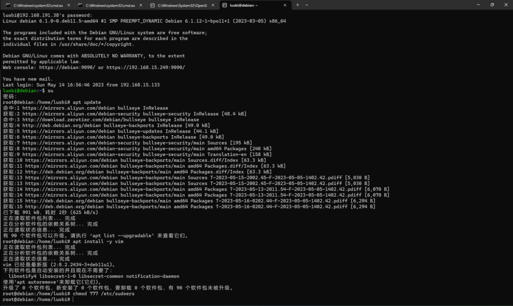 回车,输入yes然后输入你的密码,先输入su然后输入你在安装时候设置的root密码,输入apt update更新一下系统源之后输入apt install -y vim回车,安装完之后输入chmod 777 /etc/sudoers