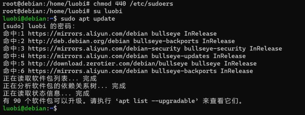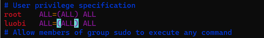 vim /etc/sudoers修改成下面图片这样,把luobi换成你们自己创建的用户然后shift+:wq回车保存退出,再输入chmod 440 /etc/sudoers回车