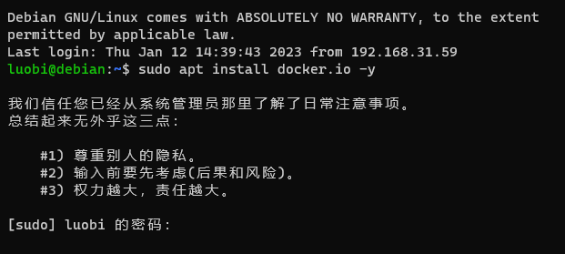 首先输入sudo apt install docker.io -y安装docker(见图1-1)输入密码并回车,就会帮你下载并安装docker,所使用的时间看你的网络以及CPU,接下来配置docker加速器先这里就可以跳转到阿里云镜像服务,登录,就能看到加速器地址(见图1-2),回到终端输入sudo vim /etc/docker/daemon.json回车,在里面按一下a,复制这段内容到里面(按住shift+ins){ “registry-mirrors”: [“你的加速器地址”] }输入之后的样子见(图1-3)esc shift+:wq保存退出,输入sudo systemctl restart docker重启docker就可以完成docker加速.